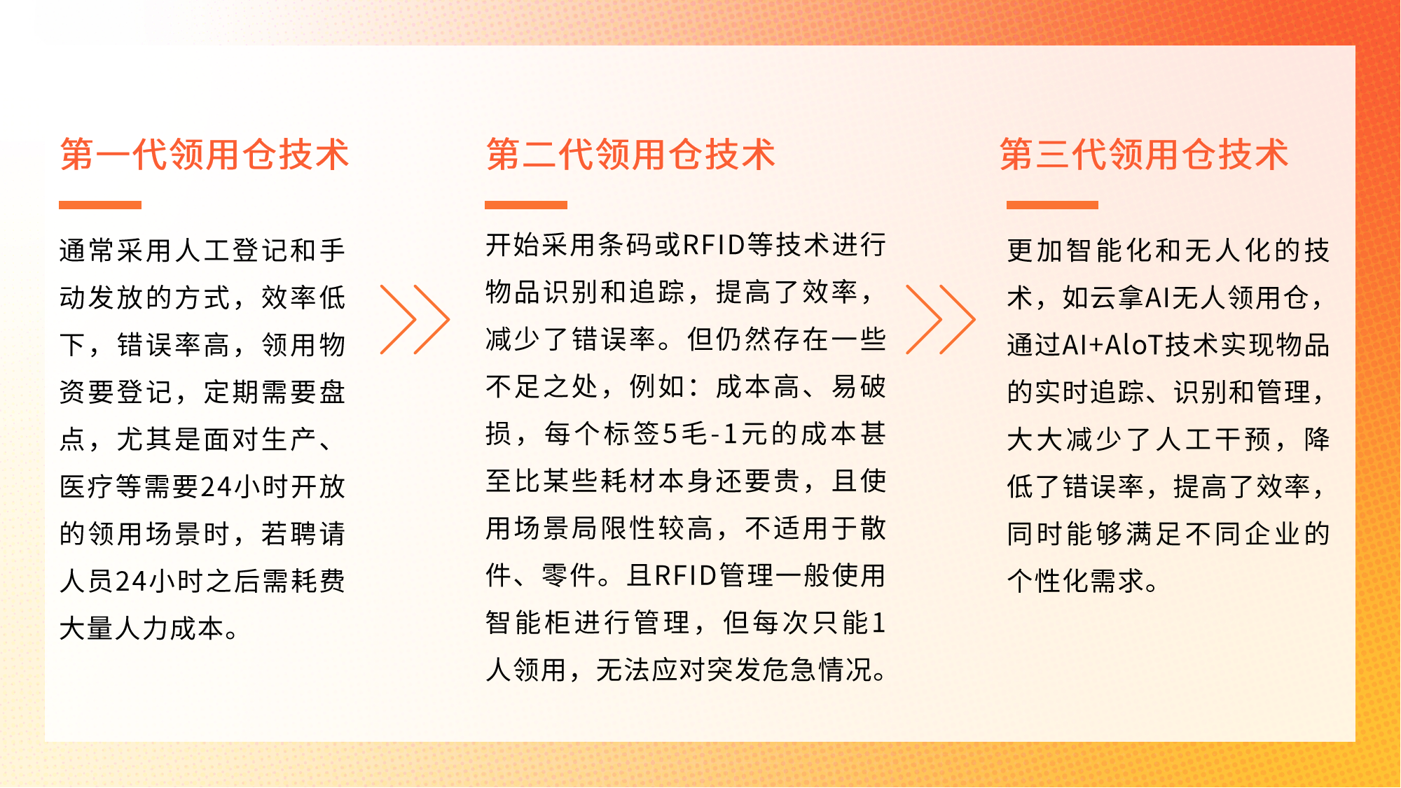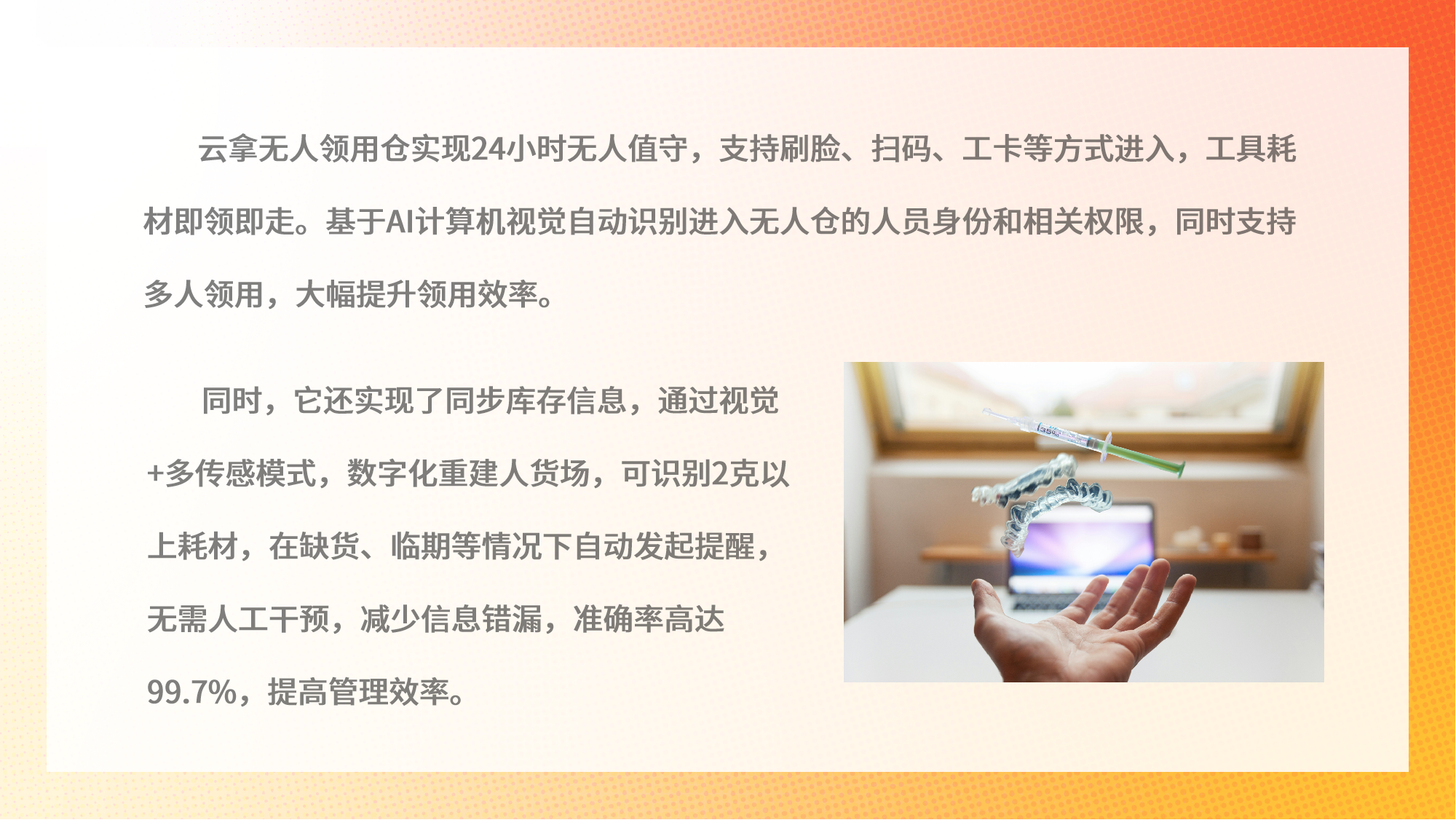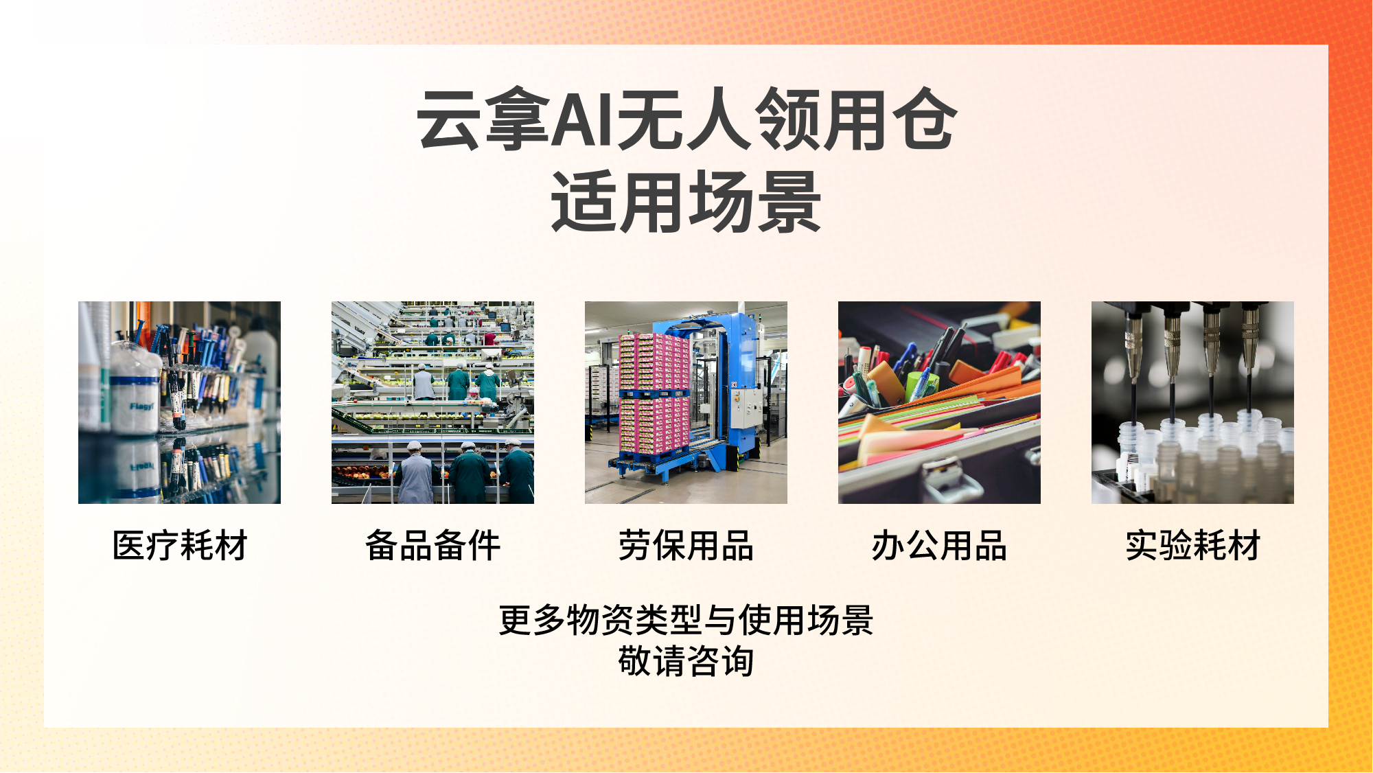 在这份《智慧领用仓储白皮书》中,我们将深入探讨云拿AI无人领用仓在多个领域的成功应用案例,涵盖医疗耗材、备品备件、办公用品以及劳保用品等多个物资种类。